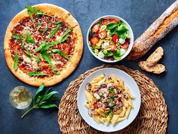 Napoli, Mozzarella Cheese, Salami, Capsicum, Spanish Onion, Artichokes, Olives, Sundried Tomatoes, Fetta, Capers, Basil Pesto